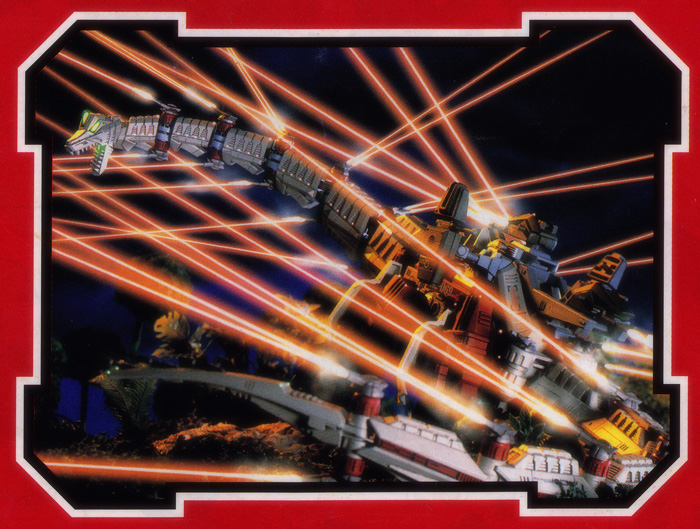 Already the only sound Zoid left in the front line was the Giga. However Giga had not yet met the final trump card that would alter the war situation. The 32-barrel Zoid core cannon. The super destructive weapon that from far away surpassed the charged particle cannon. This power was the forbidden weapon that would snatch away the Giga’s life. Giga’s back fins let off violent radiation. Nevertheless it was set free when, in a fast instant, the super-focused charged particle cannon’s zero-distance shooting penetrated Giga’s Zoid core. The pride of the Republic Army, Giga’s large form slowly fell to the ground.