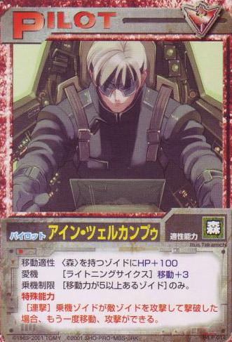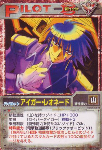 Appears in ZBC booster pack 5. He is a Saber Tiger pilot in Blitz Orbit. He excels at battles in mountainous areas.