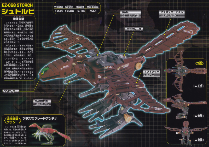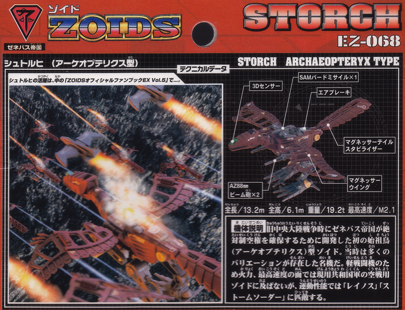 Storch was the first Archaeopteryx-type Zoid developed in order to ensure the Zenebas Empire’s absolute superiority of the air during the Old Central Continent War. Its ability well exceeded that of the Pteras, the Republic’s main fighter at the time, and kept the Imperial Air Force’s supremacy for a long time.