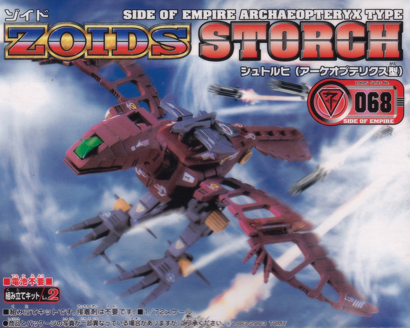 Over time Zoids improved and became larger and their weapons changed, now the Storch is considered a light fighter. Its main function is as a reconnaissance and escort Zoid. According to specs it compares poorly with the Raynos and Storm Sworder, the Zoids currently used by the Republican Air Force.