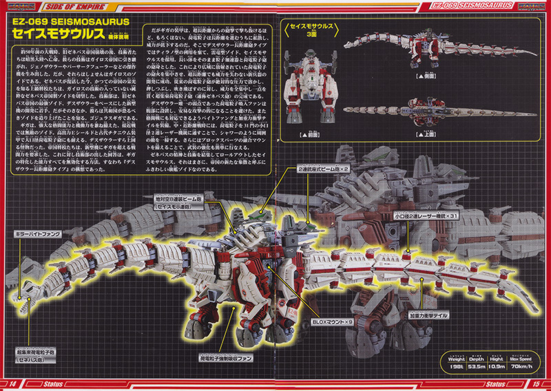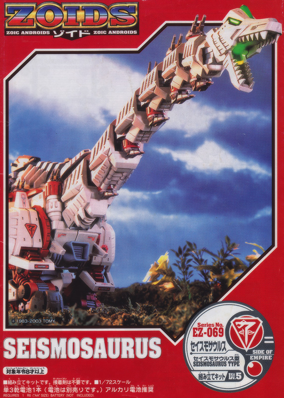 The wild Zoids that inhabit the planet Zi are living animals (such as dinosaurs, beasts and insects) with a metal exterior. Battle Zoids are captured wild Zoids that have had their Zoid Core (an interior sphere—similar to the brain, nerves, heart, etc) saved and portions of the machine replaced. While developing an anti-Giga type Zoid the Imperial technology department attained a stubborn large wild Zoid that could endure fire from a super-focused charged particle cannon. Its candidacy as a wild Zoid form of Death Saurer or Whale King rose as it was established that this brontosaurus type wild Zoid could support a heavy weight with its tough durability and energy deliverance. The wild Seismosaurus Zoid was chosen to be an anti-Giga type Zoid’s base.